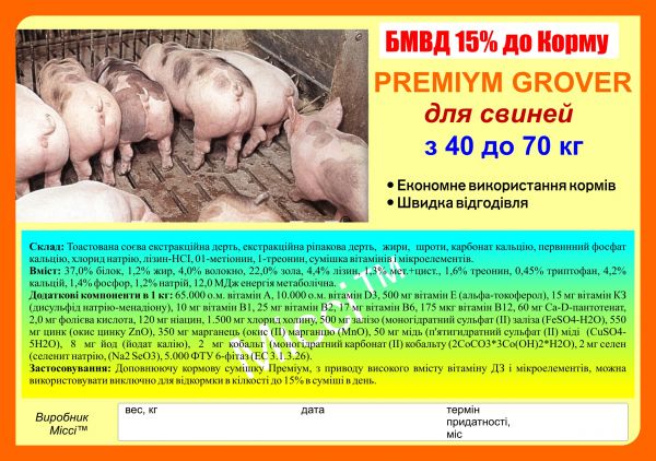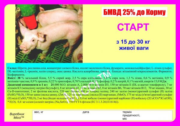 Наша компания является прямым дилером от производителя в Украине. Продаём БМВД , премиксы, комбикорма, присадки для свиноматок, поросят, молодняка дом. птицы , бройлеров, телят , КРС, МРС коз и т. д.